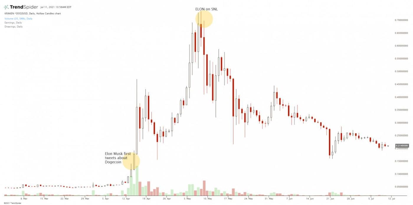 The recent DogeCoin chart is one example of this cycle as the run up started when Elon Musk first tweeted about DogeCoin on April 14th 2021 starting rumors and ended as Elon went live on Saturday Night Live on May 8th 2021 the news ran its full course.