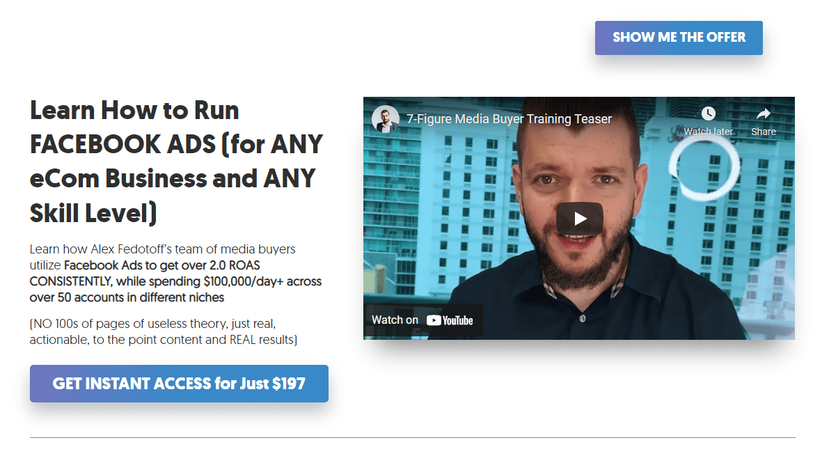 Learn how Alex Fedotoff’s team of media buyers utilize Facebook Ads to get over 2.0 ROAS CONSISTENTLY, while spending $100,000/day+ across over 50 accounts in different niches