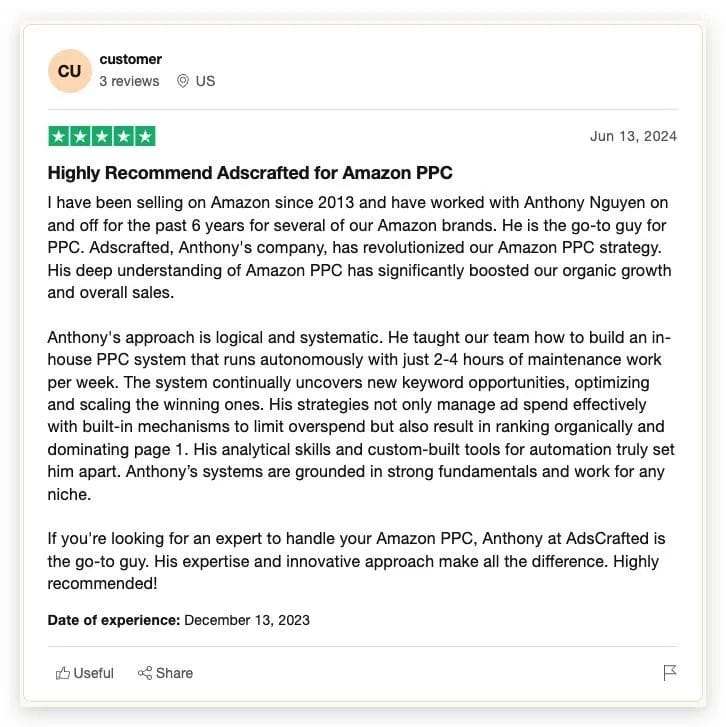 Through AdsCrafted, I teach Amazon Founders how to set up a pay-per-click system to automate and create an internal system using pay-per-click to rank and profit organically at scale.