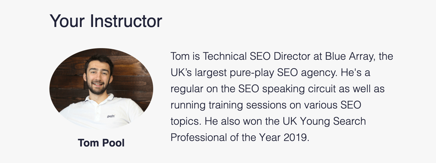 This hands-on course is run by the winner of Young Search Professional of the Year 2019 at the UK Search Awards, Tom Pool. He’ll take a deep-dive into the more advanced areas of on-page technical SEO.