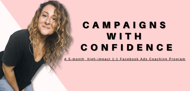 The Campaigns with Confidence 1:1 Facebook Ads coaching program includes access to my exclusive “Grow your Facebook Ads Business Course” (The Full 12-Module “Grow Your Facebook Ads Business” Course (including ios14++ updates, Conversion API, troubleshooting client ads, reporting to clients and more!) + Market your Facebook Ads Biz Bundle (including landing clients, my discovery call script, + my process for creating content and showing up), which is updated as ads continue to change!