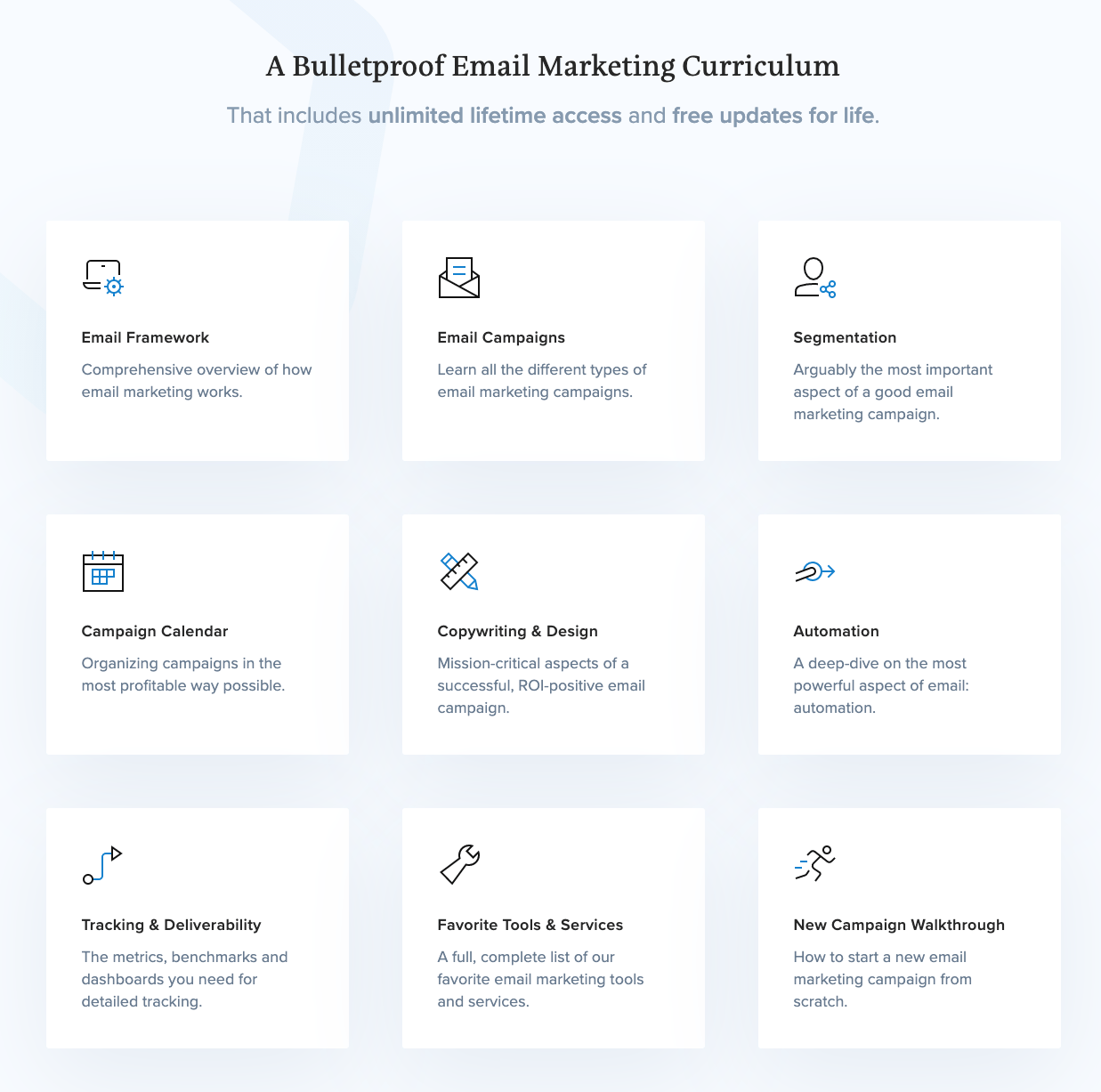 - Step-by-step walkthroughs on how to set up 8 powerful automated campaigns from scratch: onboarding, trials, booking a call, webinars, flash sales, cross-sells and upsells, cart-abandonment, and newsletters