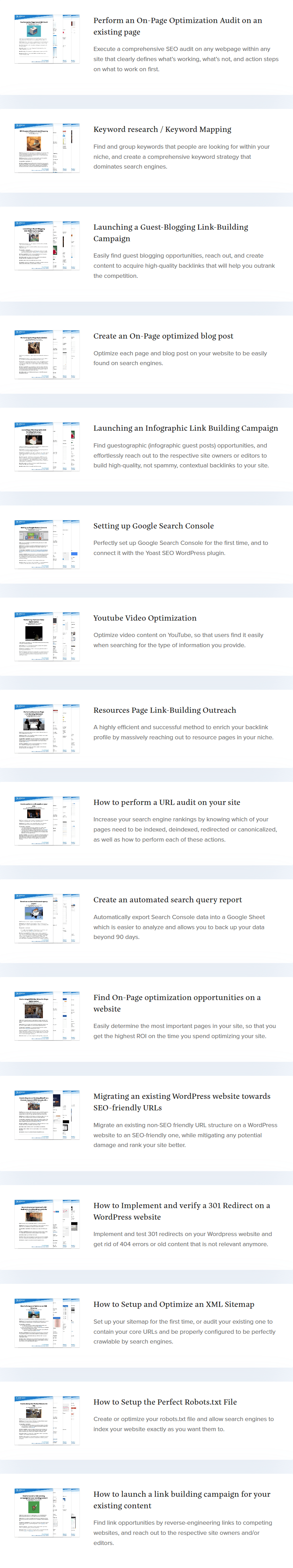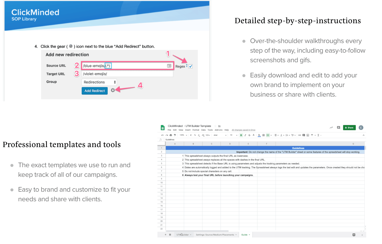 The ClickMinded SOP Library is a collection of digital marketing strategy templates, with step-by-step instructions that you can use to grow any website.
