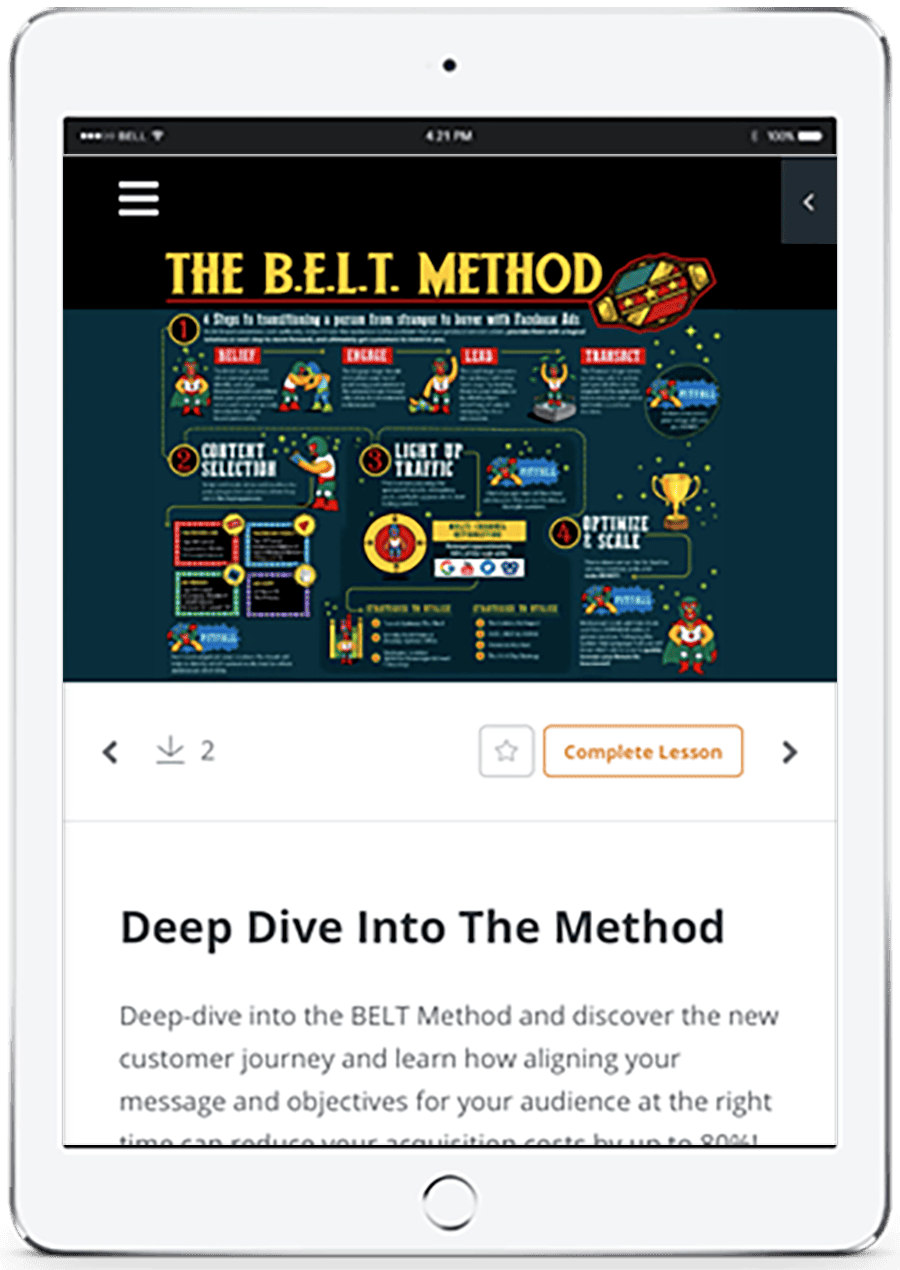 Whether you are a full-time marketer, digital agency owner, or solo-preneur running traffic for your own business – the BELT Method will provide you with the digital advertising strategies that you need to take your business to new heights.
