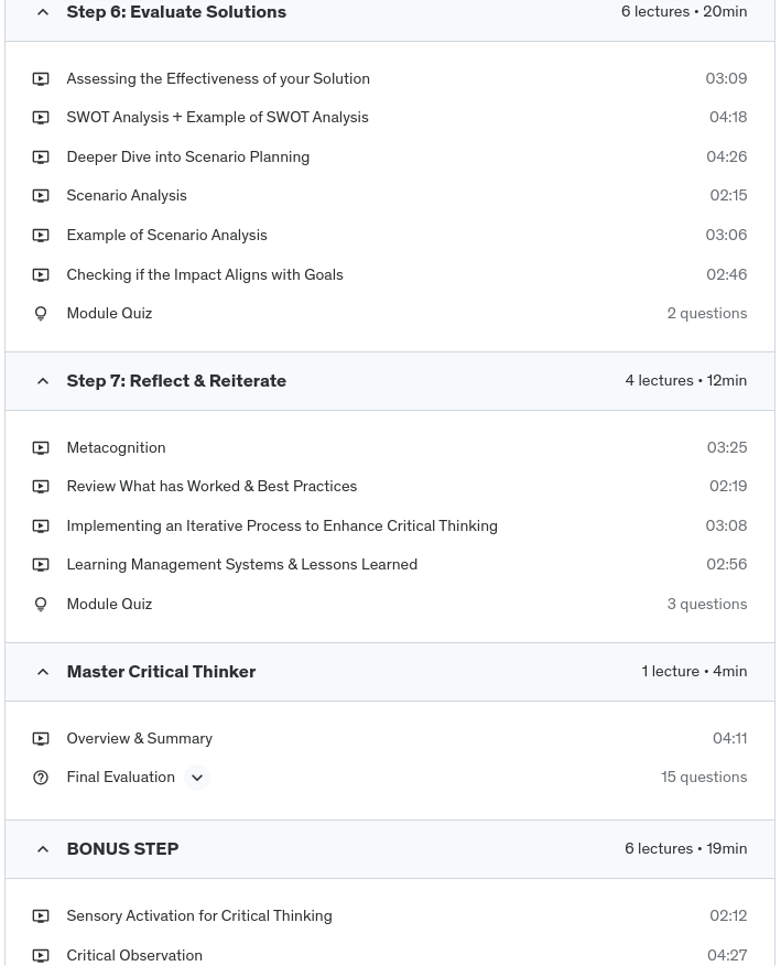 Develop your critical thinking skills with this comprehensive 7-step framework. The course provides structured techniques to master critical analysis and evaluation across diverse contexts. Learn to clearly define problems, gather comprehensive information, conduct in-depth analysis, develop optimal solutions, plan robust implementation, evaluate impact and outcomes, and iterate for continuous improvement.