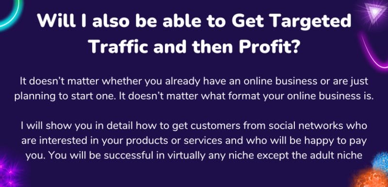 It doesn’t matter what kind of business you have, or if you don’t have one at all. You can create your own online business, promote other people’s products, make money from affiliate marketing, etc. My technique only shows how to receive CRAZY TARGETED TRAFFIC from social networks and make it bring you profit
