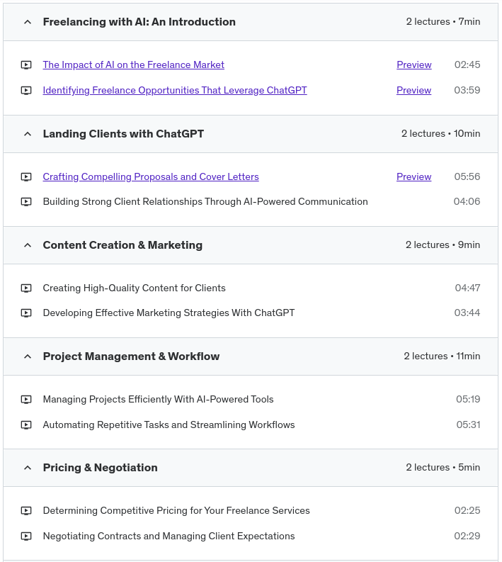 Unlock the power of AI to elevate your freelancing career! In this comprehensive course, “AI for Freelancing: How to Work Smarter and Earn More with ChatGPT,” you’ll learn how to leverage ChatGPT for every aspect of freelancing and Your Online Business —from landing clients to managing projects, creating content, and scaling your business. This course is designed to help freelancers of all levels gain a competitive edge, work more efficiently, and maximize their earnings using AI tools.