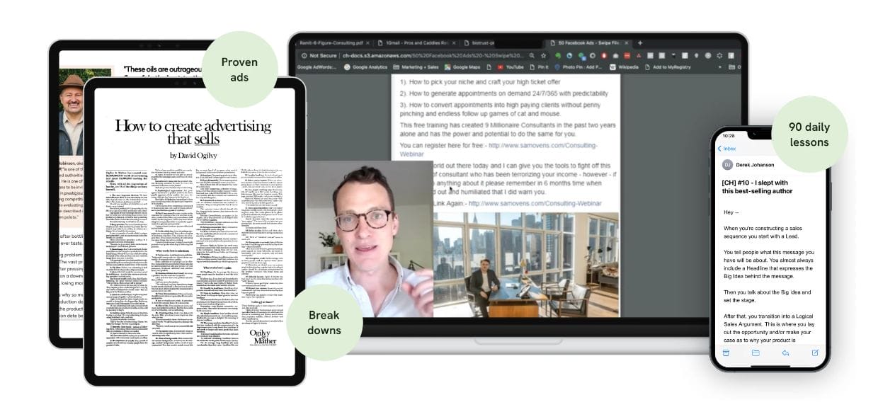 Six modules, delivered daily, for 90 days. Each module covers one essential fundamental of six and seven figure copy, along with daily pieces of curated copy that you will hand-write to hard wire the lessons.