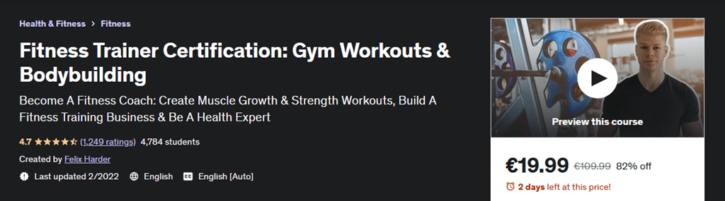 Hi, I’m Felix Harder fitness coach and certified nutritionist. My “Fitness Trainer Certification” is designed for anyone who wants to coach others about gym workouts – be it for bodybuilding, strength training or muscle growth.
