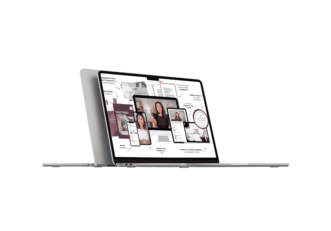 Fractional Freedom is a hands-on consulting certification program designed for those who want to become in-demand consultants without being chained to reporting, ads management, or tedious project details. Using Laura’s proven L.E.A.P. methodology, you’ll learn how to craft premium offers, drive tangible results for clients, and enjoy the flexibility to live life on your terms.