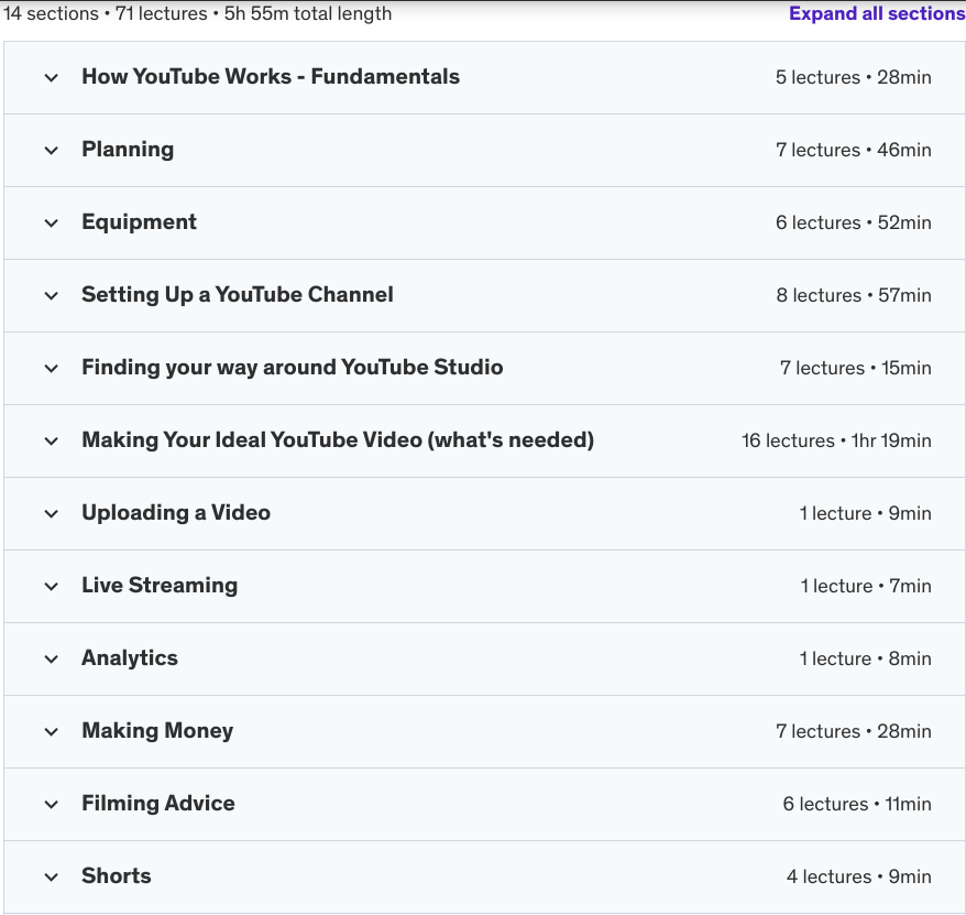 This course covers everything you need to know from discovering what to make your channel about, planning, branding, filming, equipment; how to upload; how to use tags and titles and how to review your analytics inside YouTube.