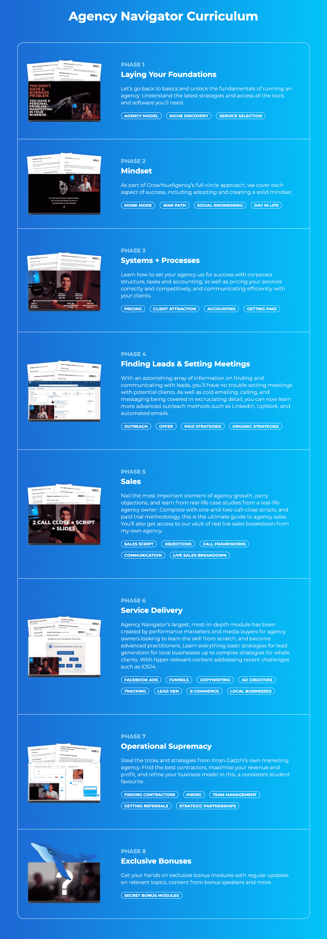 Over 50 hours of step-by-step training covering EVERY aspect of building an agency from scratch. This is almost a plug & play system with enough success stories to back it up! Signing clients, running Facebook ads, building out your team, on-boarding clients, invoicing, sales… this course has everything covered for you.