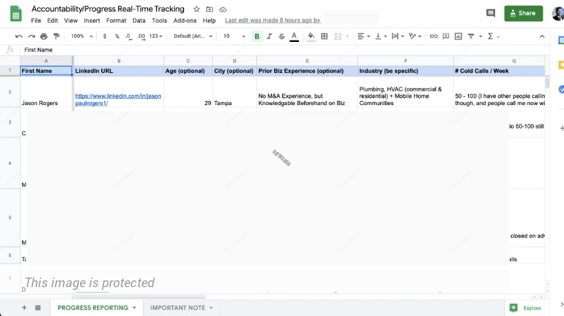 Everyone following the program tracks their progress in this single spreadsheet approximately once per week. This, along with the Zoom calls and the FB group, works to keep our clients accountable and get them where they need to go… We want to drive out human potential. We take results very seriously.