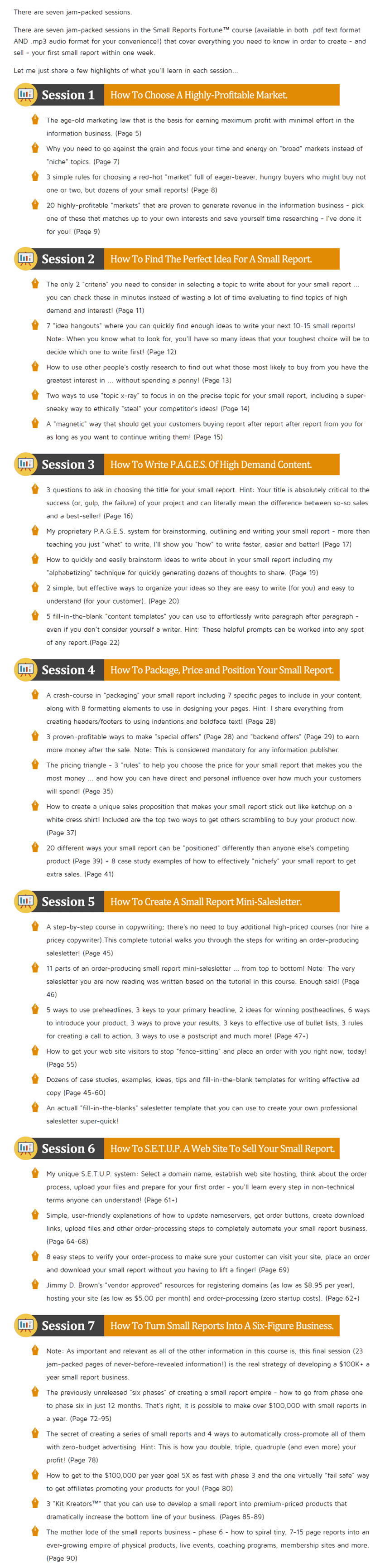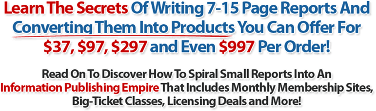 - How To Turn Small Reports Into A Six-Figure Business. This is a never-before-revealed system for turning tiny reports into a $100,000+ per year business. Even if you’ve been creating information products for years, this one section (which is actually 23 pages long!) will reveal things about creating an information empire that you’ve never put together before. I share everything in the “six phases” of a six-figure business with small reports. Each phase builds upon the previous one to create a multi-stream business that continues to grow month after month. It’s the ultimate guide to “bundling” small reports into products you can offer for $37, $97, $297 and even $997. Disclaimer: I do not guarantee you will earn six-figures with your business, nor any money at all for that matter. I don’t know you, your abilities, you effort, your decision-making, etc. Beware ANYONE who “guarantees” success of any kind without knowing you personally!