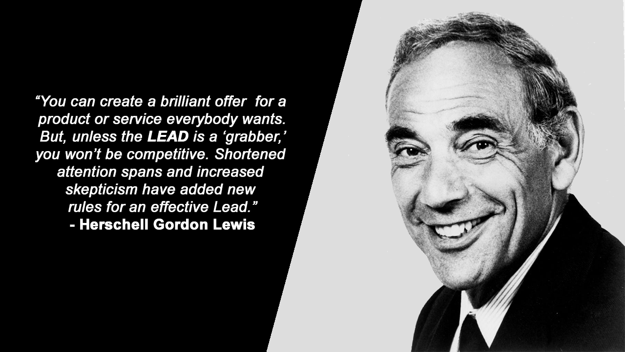 “You can create a brilliant offer for a product or service everybody wants. But, unless the Lead is a ‘grabber,’ you won’t be competitive. Shortened attention spans and increased skepticism have added new rules for an effective Lead.”