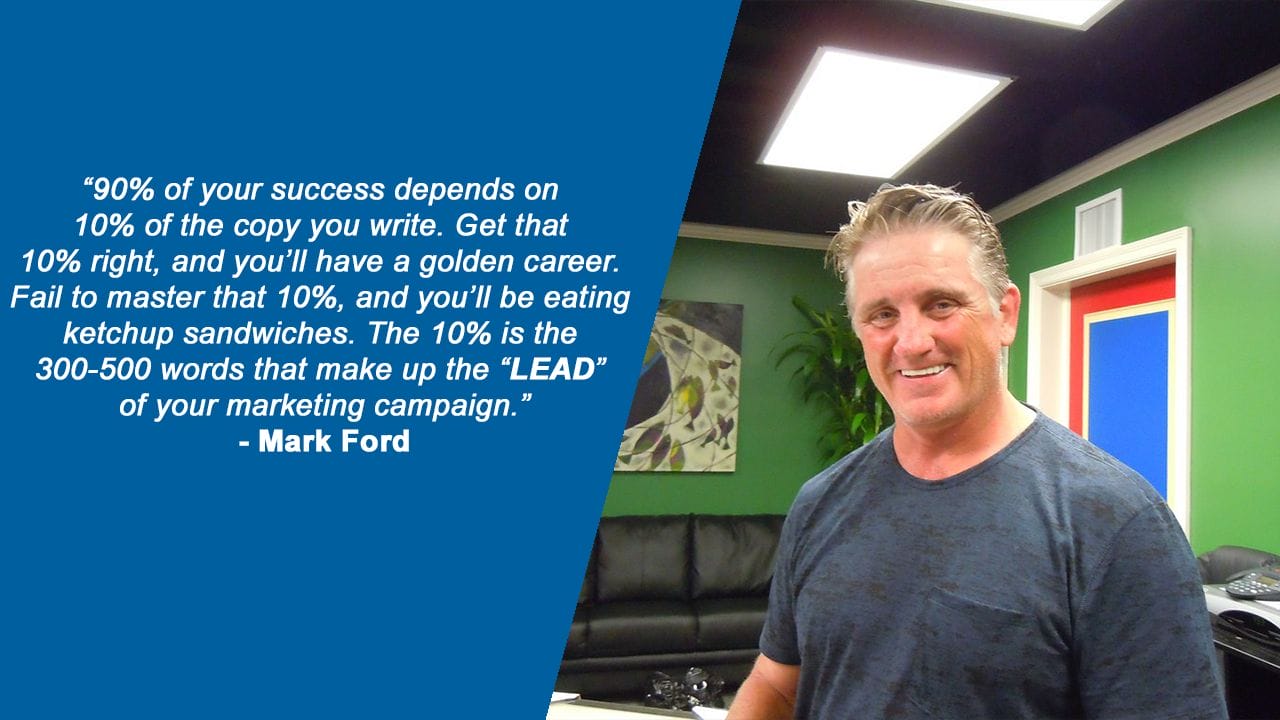 “90% of your success depends on 10% of the copy you write. Get that 10% right, and you’ll have a golden career. Fail to master that 10%, and you’ll be eating ketchup sandwiches. The 10% is the 300-500 words that make up the “Lead” of your marketing campaign.”