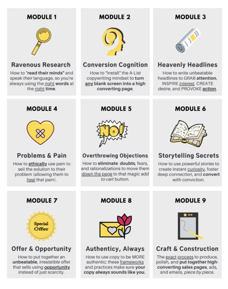 Over 12 trainings across 8 modules, this is the core of your copywriting education. Whether you’re a veteran or just starting out, these trainings will have you writing captivating copy by the end of the course.