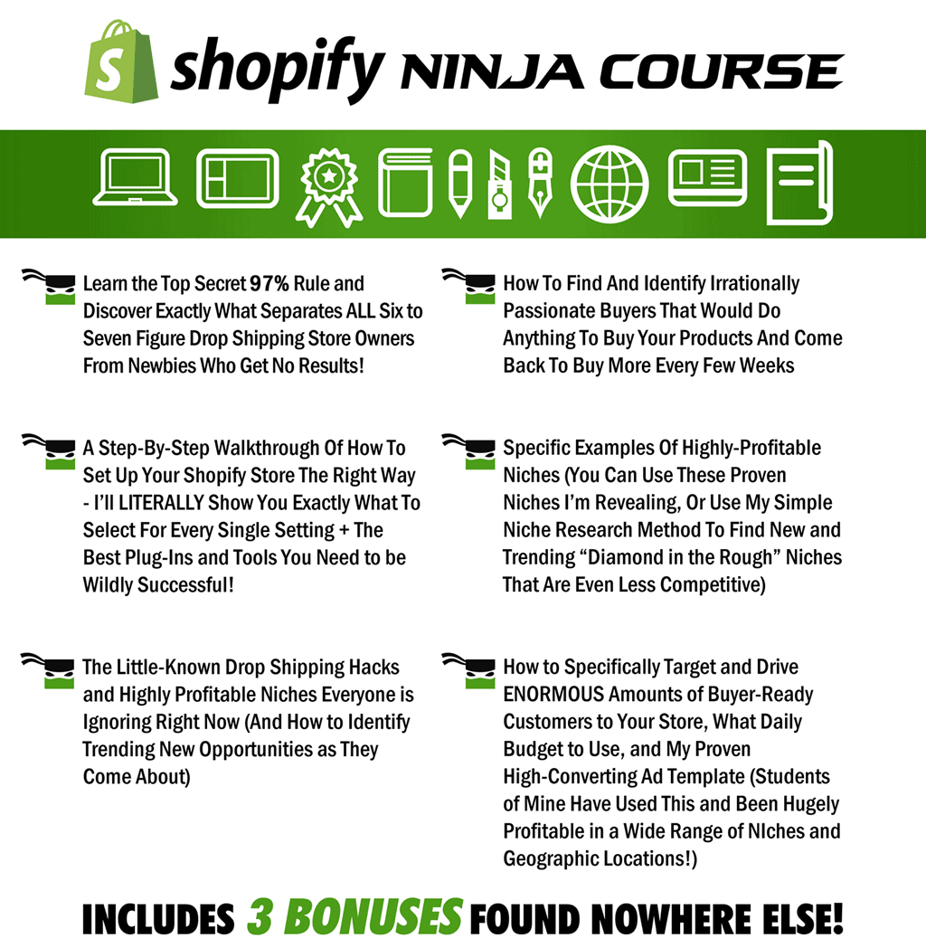 - ($1,997 VALUE) THREE EXCLUSIVE BONUSES FOR LAUNCH WEEK Get Exclusive Access to Our 3 BONUSES During The Shopify Ninja Masterclass Launch Week Only! These Bonuses Include The Master List of the MOST Profitable Niches for 2018, How to Make a Print on Demand T-Shirt Empire, and How to Use Clickfunnels to EXPLODE Your Shopify Business!
