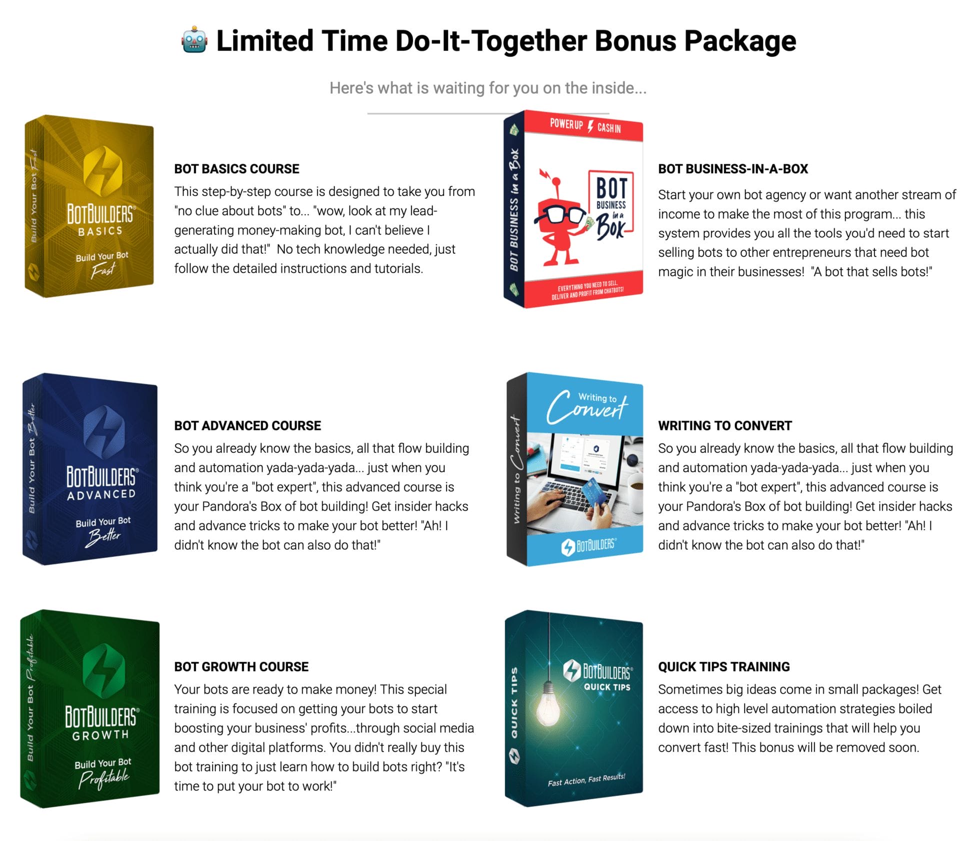 - BotBuilders Basics, Advanced and Growth Courses ($997 value)