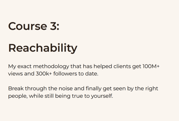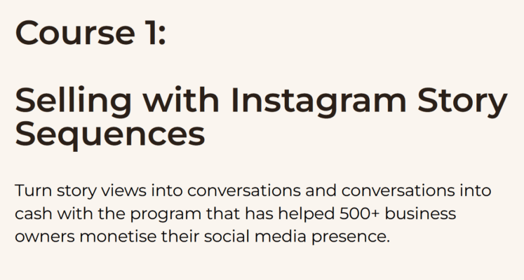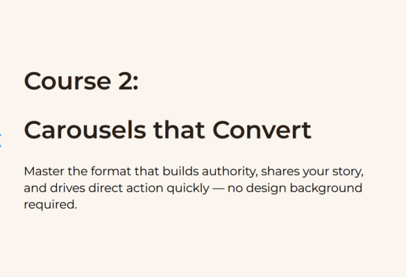 These are full courses created by me with step by step instructions. You’ll learn my reach strategy, carousels, funnels, content that converts, leads, freebie design, brand strategy, and a lot more.