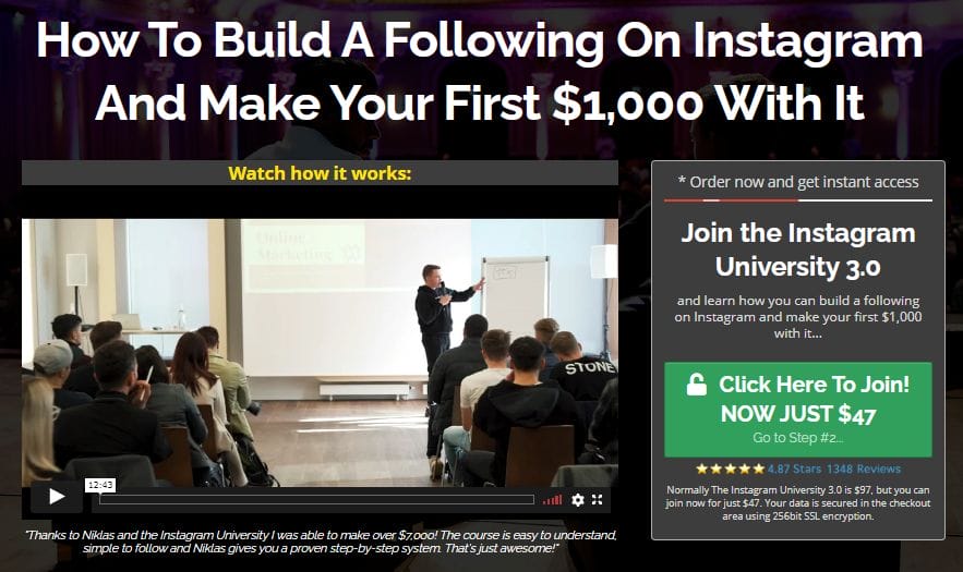 With it, you’ll have access to 3,5+ years of experience, you´ll know exactly how Instagram works, you’ll have a step-by-step blueprint that you can simply follow and use to build your own following on Instagram and you‘ll get access to battle tested and proven strategies that you can use to make your first $1,000 with Instagram.