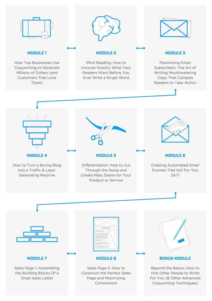 All-New Copy Teardowns: Watch me tear down and rewrite other students’ copy on the spot. You’ll even get to listen in on a call with me and one of my senior writers as we create sales funnels and sales pages for a $25,000 product. Learn how to think like a copywriter and see how you can create compelling sales copy out of thin air.