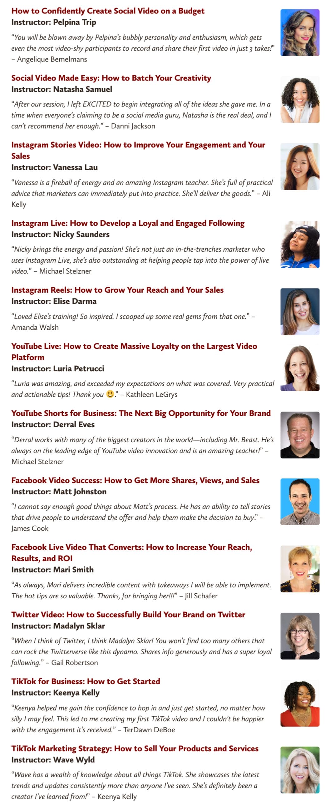 You’re about to be coached by 12 of the world’s best social video marketing pros for an entire week. Each expert is a dedicated specialist. They live and breathe social video, delivering results for their clients every day. And they’ll share their proven strategies with you.