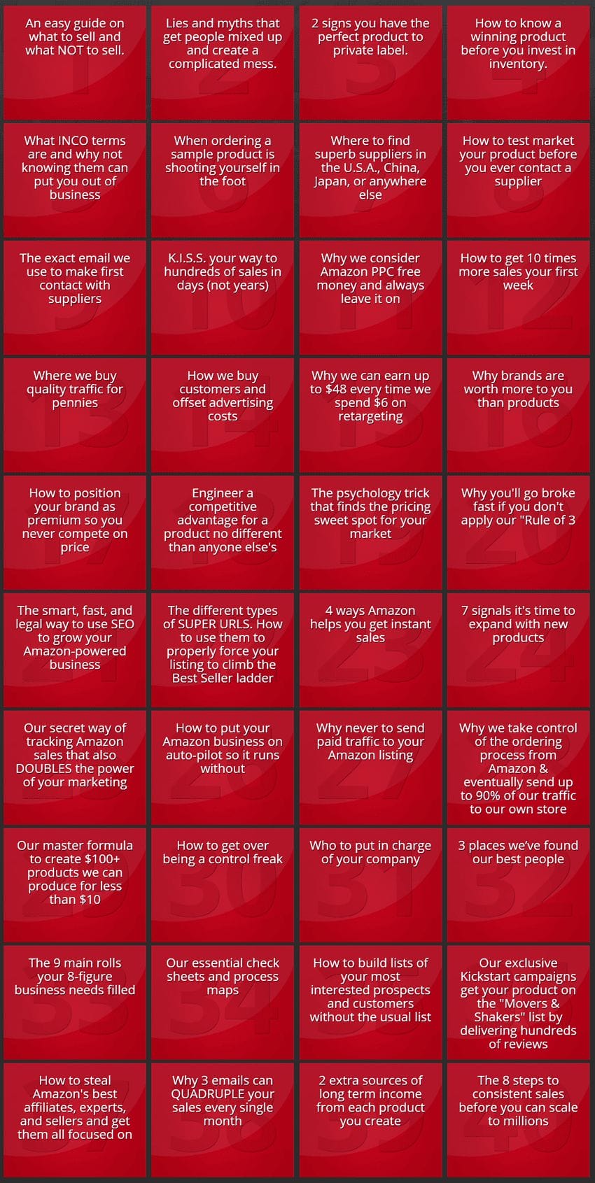 Your ECOM MASTERS core curriculum includes all the tutorials you’ll need to build your physical product business step by step — so beginners and experienced Amazon sellers alike can use the 12+ hours of content to train themselves and anyone on their team.
