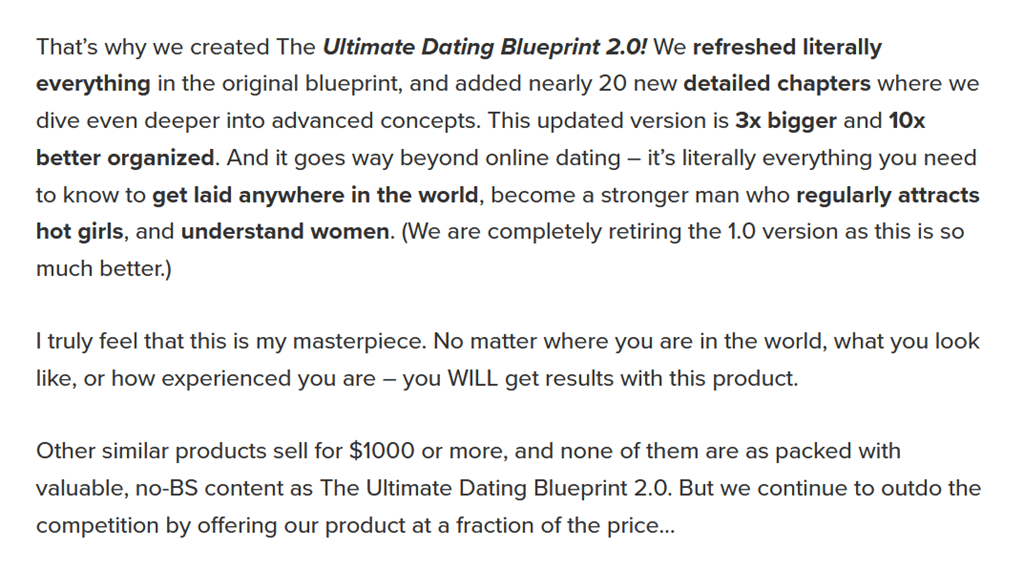 Introducing The Ultimate Dating Blueprint 2.0. The updated and enhanced version of our dating product that is a literal A-to-Z Bible of Everytning You Need to Know to regularly get laid with hot women.