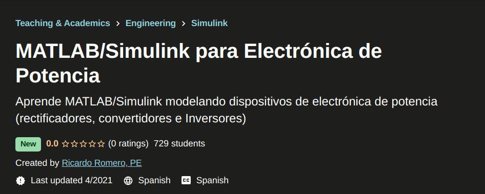Este curso está diseñado para permitirle simular cualquier dispositivo de electrónica de potencia en MATLAB/Simulink, incluidos rectificadores, convertidores de CC a CC e inversores. Este curso no sólo da un repaso de la teoría de cómo funcionan los rectificadores, convertidores de CC a CC e inversores, sino que también da varios ejemplos sobre cómo simular estos dispositivos utilizando MATLAB/Simulink. Los modelos en MATLAB/Simulink para los dispositivos de electrónica de potencia creados durante las lecciones están disponibles para su descarga con cada leccion. El curso se divide en las siguientes secciones: