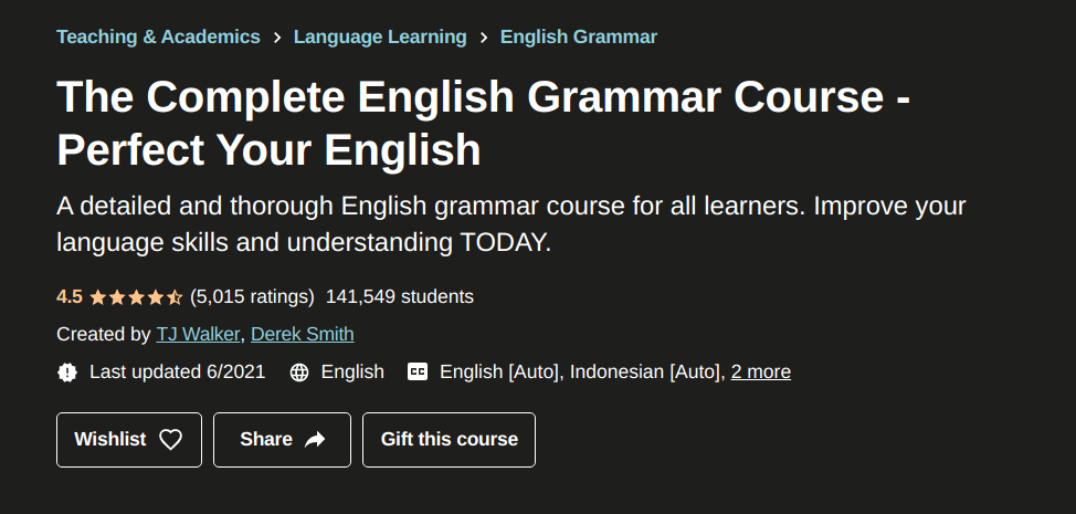 This Udemy course gives you, the English language learner, a complete overview of English grammar.
