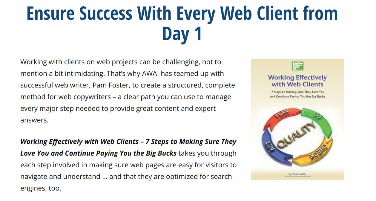 Working with clients on web projects can be challenging, not to mention a bit intimidating. That’s why AWAI has teamed up with successful web writer, Pam Foster, to create a structured, complete method for web copywriters – a clear path you can use to manage every major step needed to provide great content and expert answers.