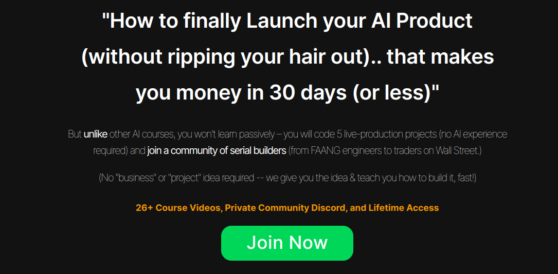 Let’s be honest.No one likes learning just for the sake of learning. We’re builders at heart. Builders want to create products that users fawn over.You could learn everything yourself, piecing together YouTube videos, reading through technical documentation, trying out different tips and tricks on Twitter.But imagine this:You go through the entire journey of not knowing anything about AI to building and shipping your first chatbot or your first AI voice app.BuildFast Academy was created for that exact reason.