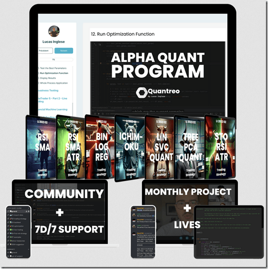 Quantreo – Alpha Quant ProgramMY READY-TO-USE METHOD TO CREATE QUANT TRADING STRATEGIES …The program you need to create your first PROFITABLE trading bot in one month !After this program, you will be able to create your own trading strategy from scratch using technical indicators or Machine Learning trading strategies. You will be able to evaluate them properly and put them in live trading.