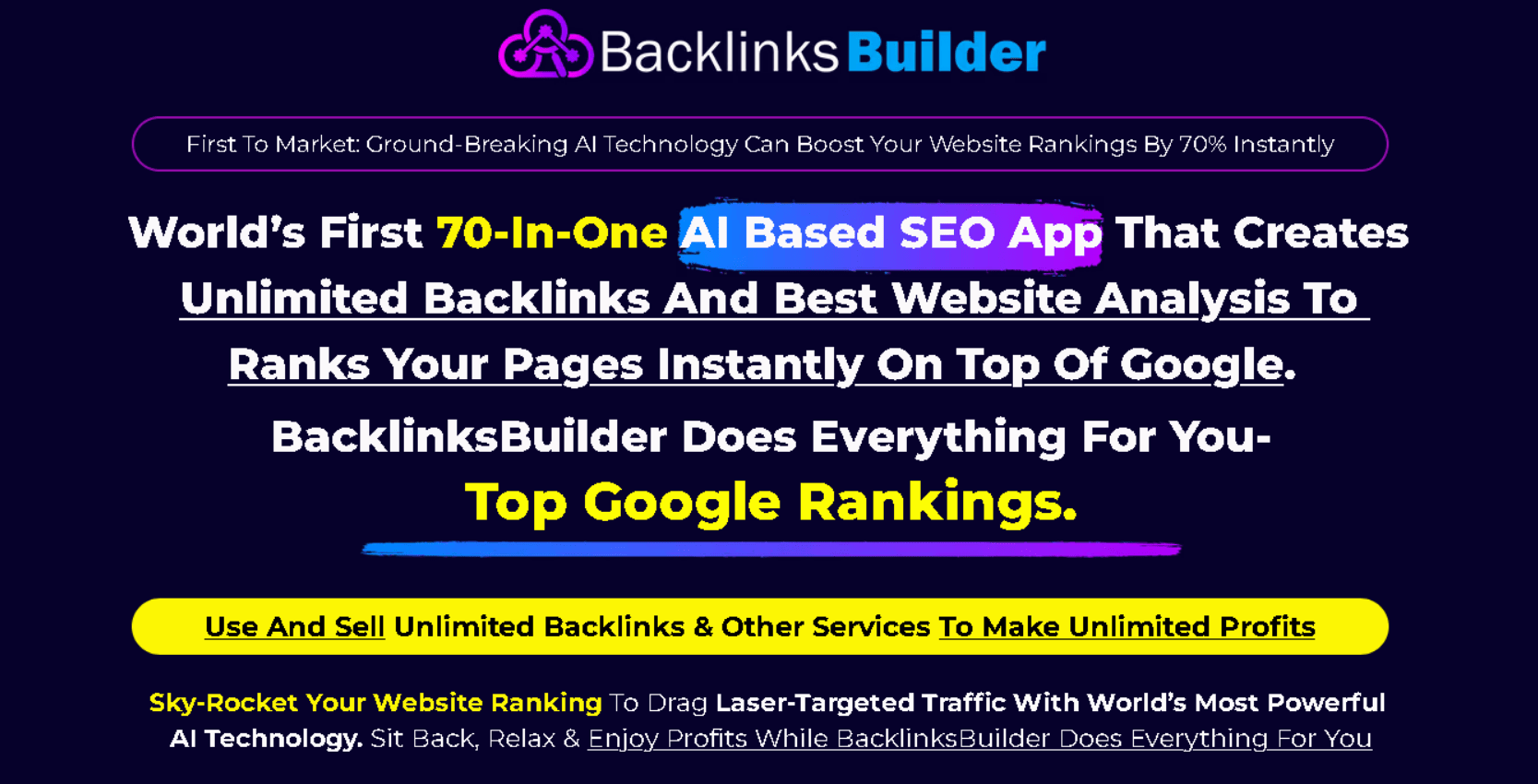 World’s First 70-In-One AI Based SEO App That Creates Unlimited Backlinks And Best Website Analysis To Ranks Your Pages Instantly On Top Of Google.