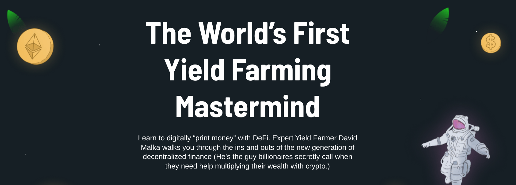 The world’s only yield farming mastermind. Over 20+ hours of advanced training on how to locate and profit from the highest yields. One private community of Yield Farmers sharing intel before it hits the mainstream. Access to our proprietary yield farming tools, spreadsheets, and systems.
