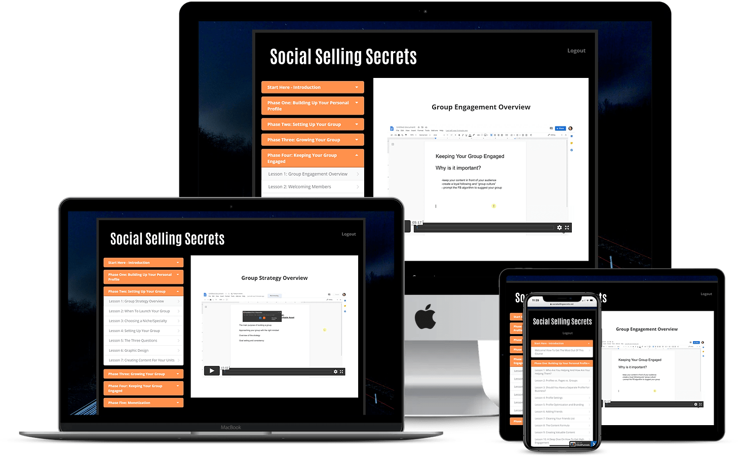 With over 10 hours of video content, Social Selling Secrets breaks down the process of building a profitable personal brand into five phases: Building Up Your Personal Profile, Setting Up Your Group, Growing Your Group, Keeping Your Group Engaged, and Monetization.