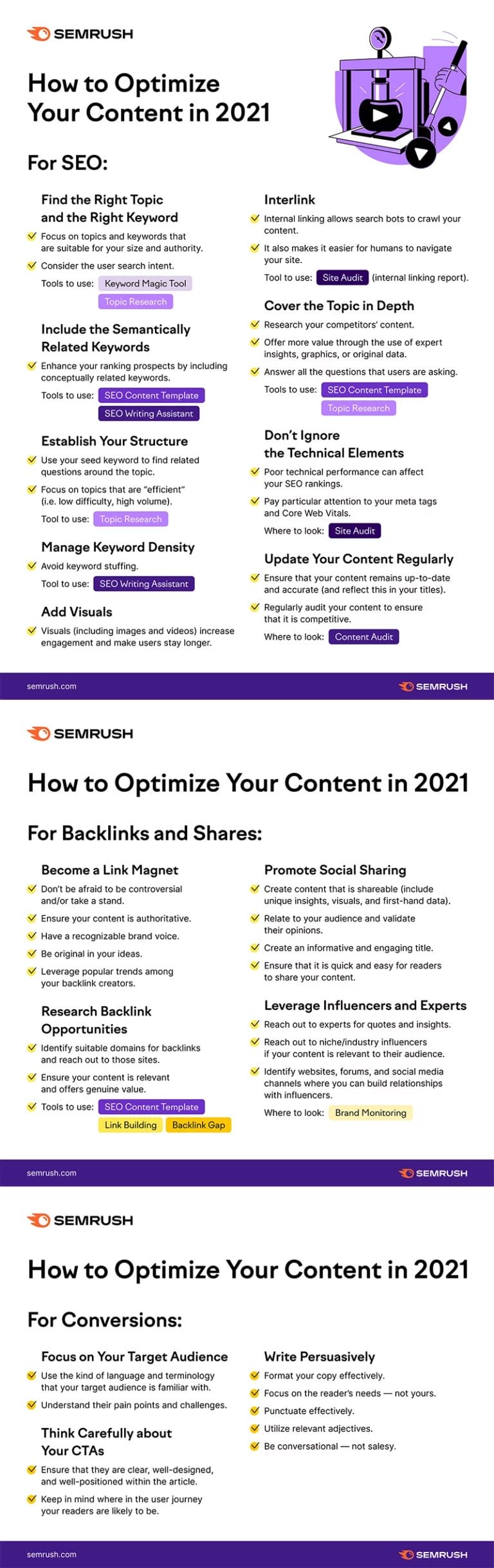A new infographic on Social Media Today shows that if you’ve been looking for ways to improve your SEO performance and you want to optimize your content for Google and convert more traffic into leads, the team from SEMrush offer tips for success along with tools to help you implement a strategy.