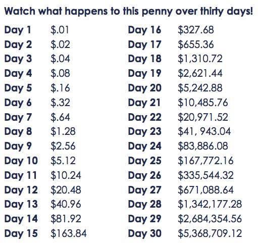 If you start with a penny and double the money as it grows every day for a 30 day month you will have $5,368,709.12.