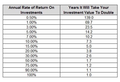 Annual compounding of capital can also double money over years at different rates based on returns. Years to double your money