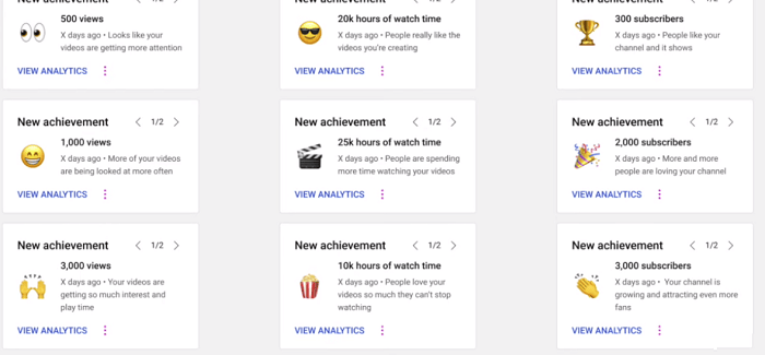 The new, emoji-based achievement notifications will show up in YouTube Studio when channels reach certain levels, on various fronts: